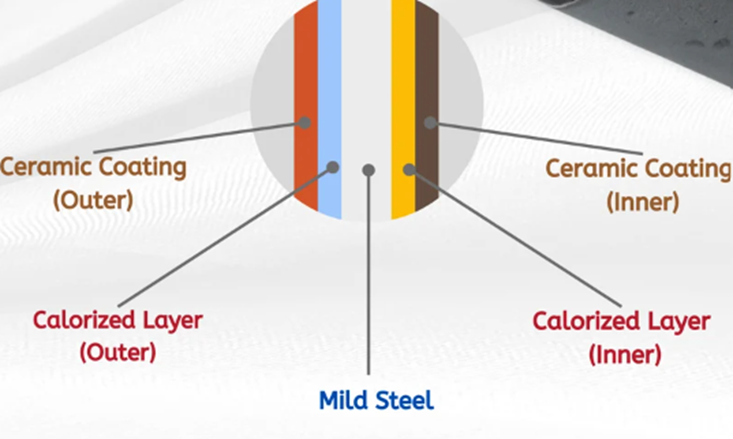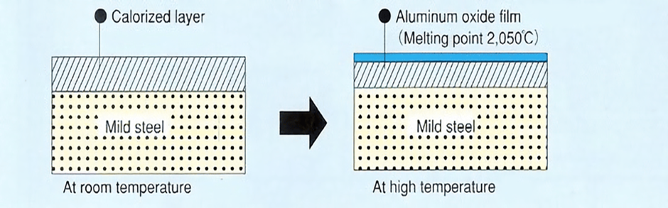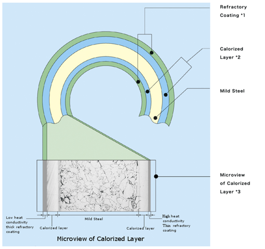 Using diffusion technology, mild steels are heated to 1,000°C, allowing aluminum to penetrate the material and create a durable aluminum-iron alloy (calorized layer) on both inner and outer surfaces. The product then undergoes a ceramic coating process to enhance heat and oxidation resistance.