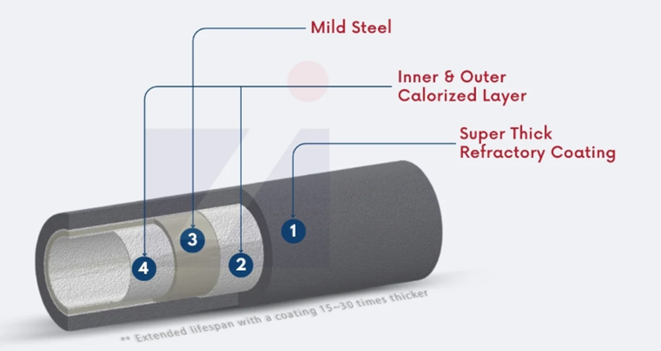 Heavy Lance is a specialized lance pipe made from heat-resistant calorized steel and coated with an exceptionally thick refractory layer—15 to 30 times thicker than conventional coatings. This advanced coating significantly enhances its resistance to extreme heat and thermal shock.