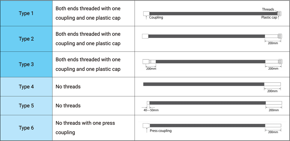 Calorizing Lance Pipes of Type 1, 2, 3 will include both ends threaded with one coupling at one end and the other end with one plastic cap. This way it helps to connect the pipes quickly and immediately while fully consuming the Calorized Lance Pipes.